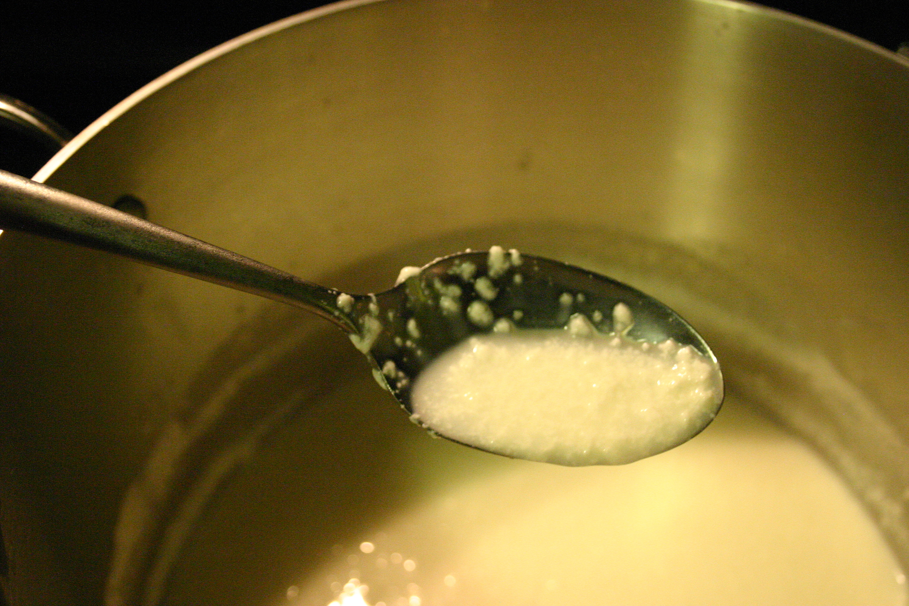 After you pour the fresh lemon juice in, turn the heat down to a simmer and stir very gently. The mixtures should begin to curdle after a minute or so. If your mixture doesn’t start to curdle, don’t freak out…like me! Just calmly pour in more lemon juice one teaspoon at a time until you see a reaction, and be sure the mixture is really simmering.