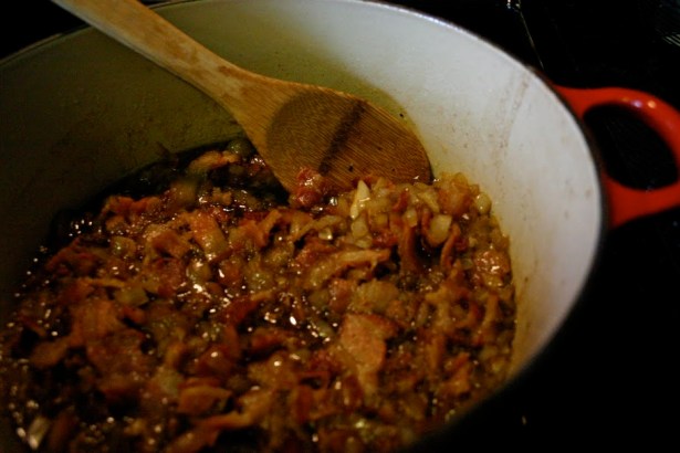 1. Cook bacon in a large cast iron pot over medium heat, stirring occasionally, until fat is rendered and bacon is lightly browned (approximately 20 minutes, depending on the thickness of the bacon). With a slotted spoon, remove the bacon and place on a platter lined with paper towels.