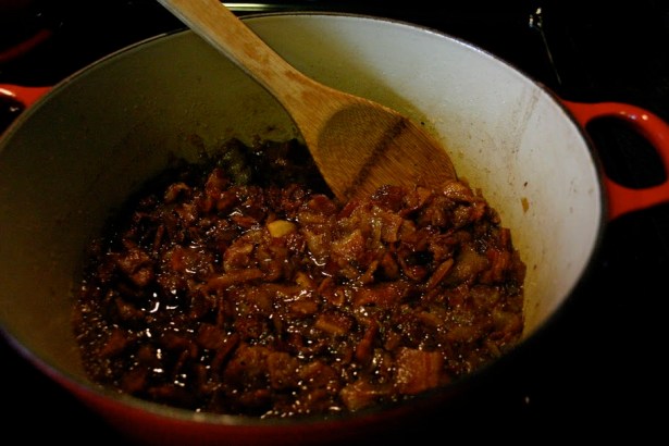 Bacon mixture after an hour of cooking. Stir periodically to make sure it’s not cooking too quickly and burning.