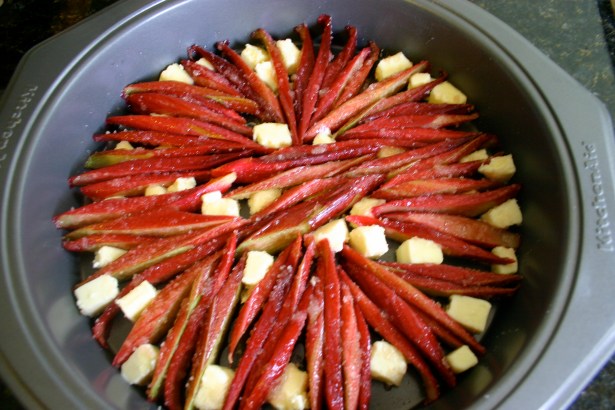 1. You should try this again with the caramel topping I made on my nectarine upside down cake (recipe on my blog of course), I think it could be pretty tasty for you, and it will help you to lay the rhubarb in a pattern that holds – if you would like of course, but this sounds pretty good too!