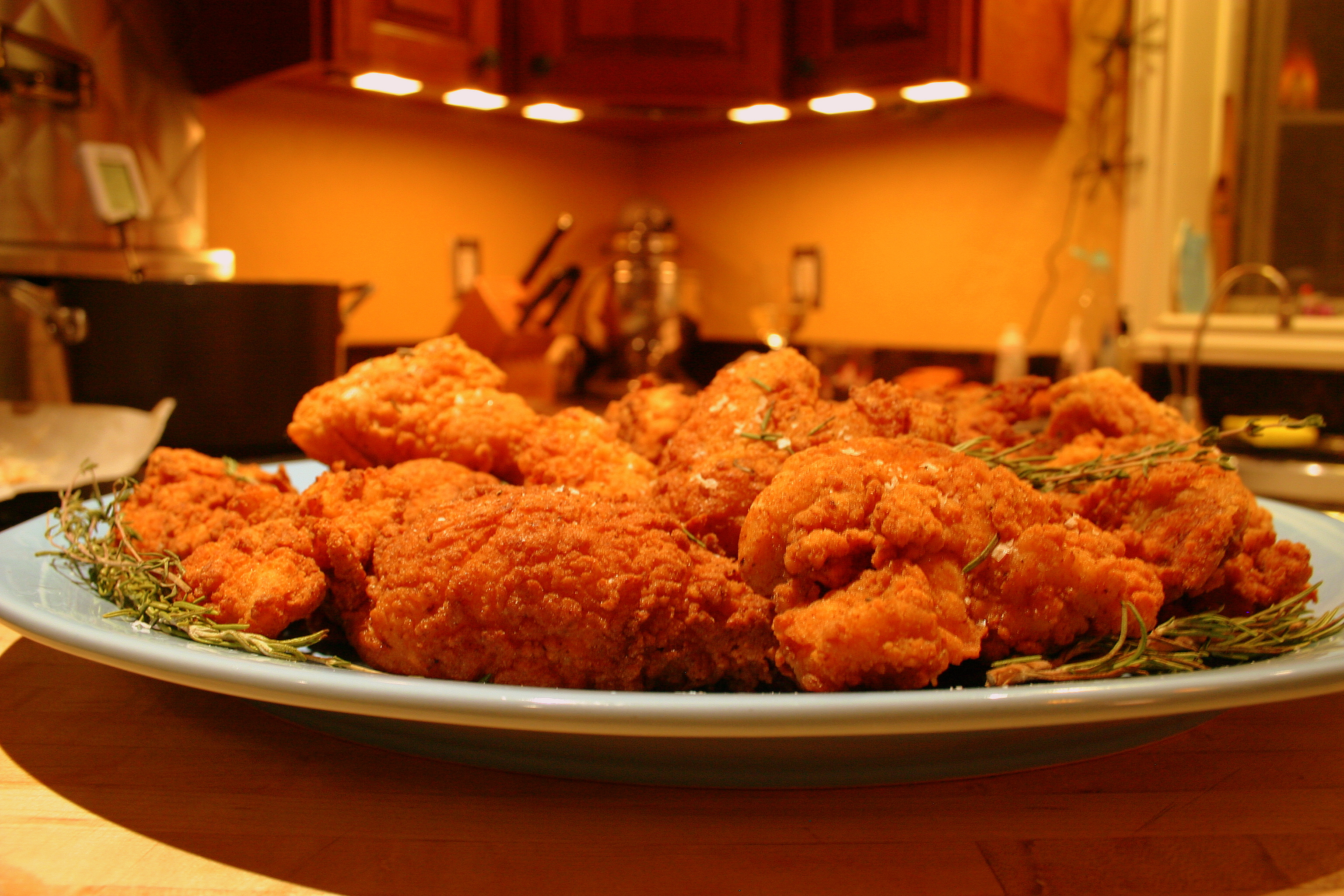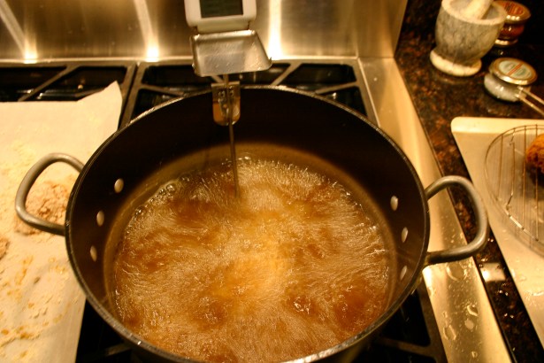 A deep fryer would be ideal for a job like this, but alas I had to opt for the stove top. A candy or oil thermometer will help you control the frying temperature and a meat thermometer will help you determine if the chicken is fully cooked after you pull it out of the oil.