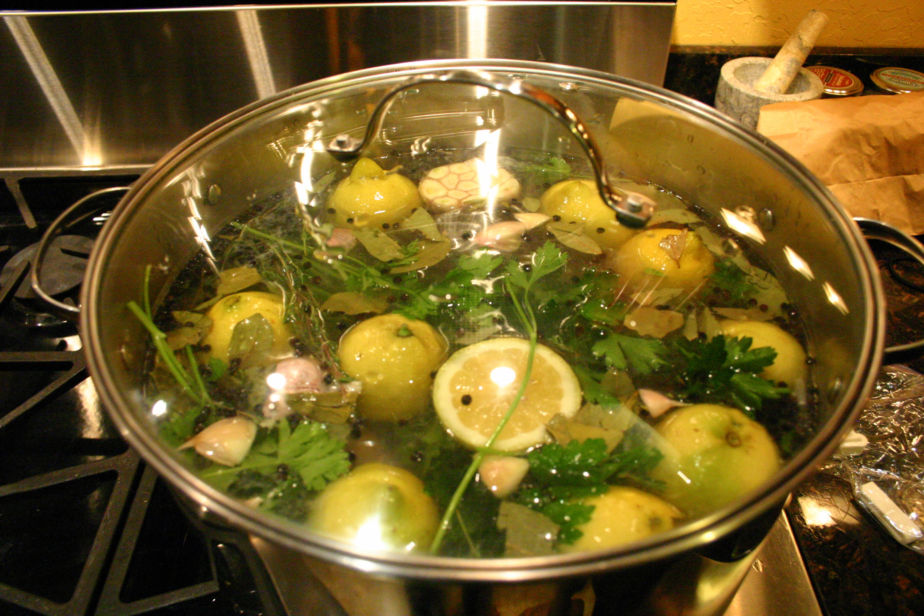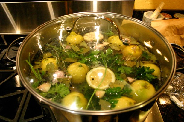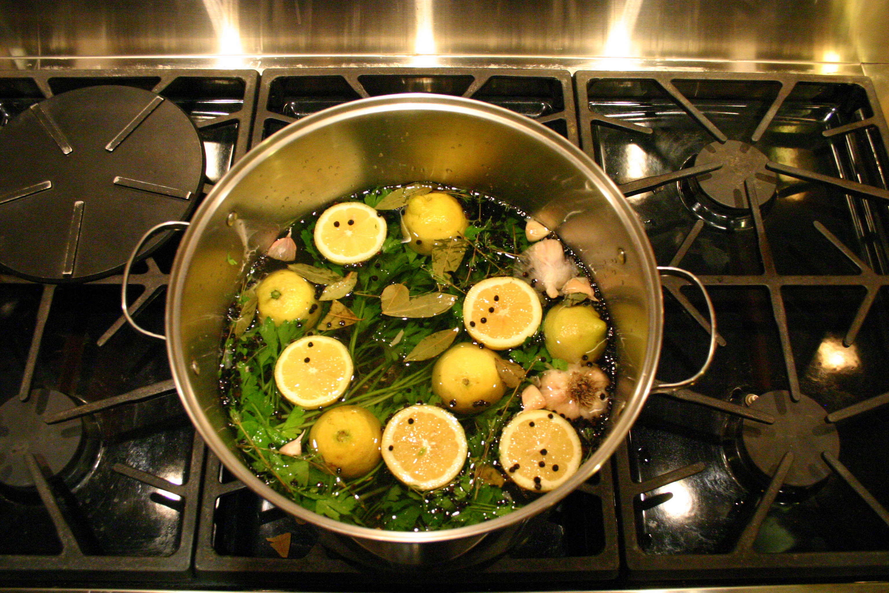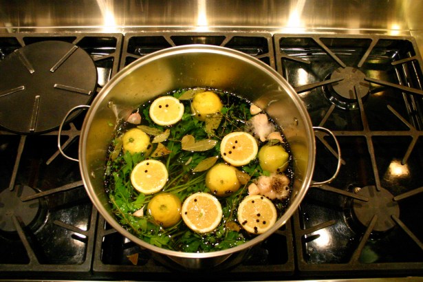 1. Make the brine: Combine all the ingredients in a large pot, cover, and bring to a boil. Boil for 1 minute, stirring to dissolve the salt. Remove from the heat and cool completely, then chill before using. The brine can be refrigerated for up to 3 days.