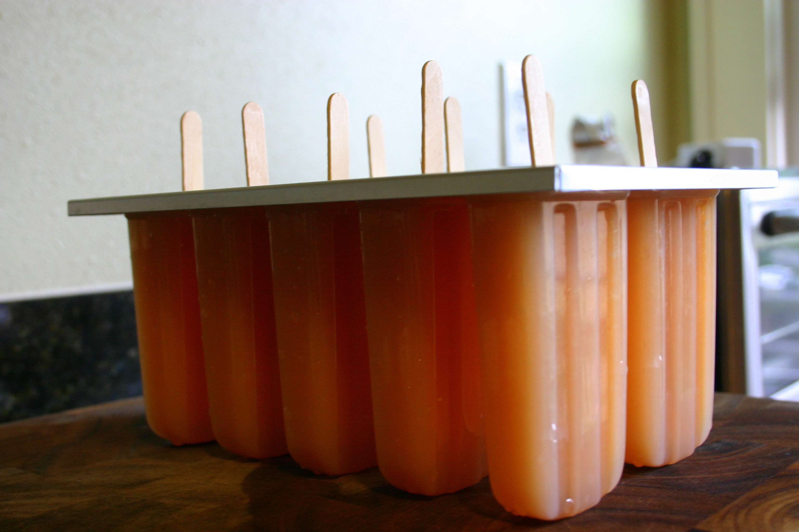 Fill the popsicle molds leaving a 1/4 inch of space from the top. The mixture will expand in the freezer. Turn up your freezer to the highest setting and let the popsicles set for about five hours.