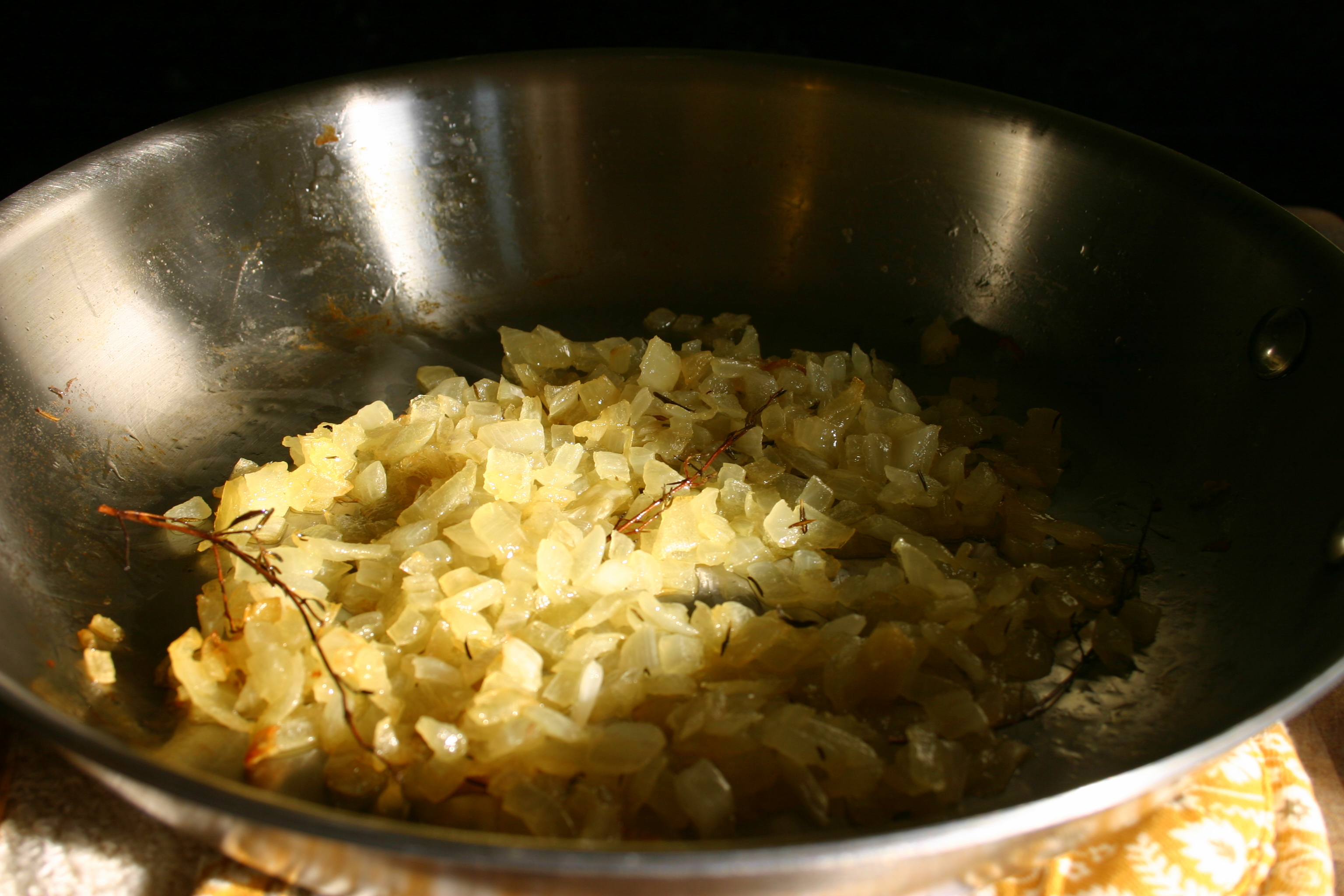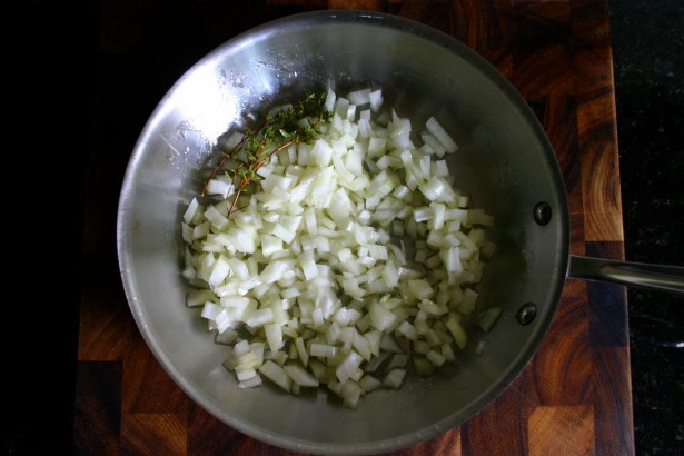 - Preheat oven to 375°F. Place onions in a small oven-proof pan and add enough olive oil to coat, along with a generous pinch of kosher salt. Add thyme sprigs to pan if using and stir well. Place pan in preheated oven for 30-35 minutes, stirring occasionally to prevent onions from burning. The onions are ready when they are tender and golden. Remove the thyme stems if using.