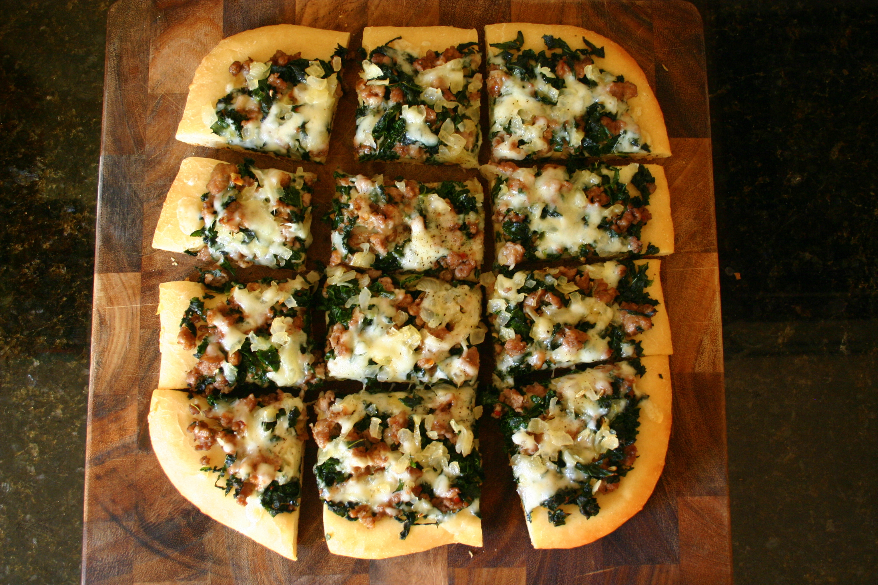 Kale, Italian Sausage, and Roasted Onion Pizza
