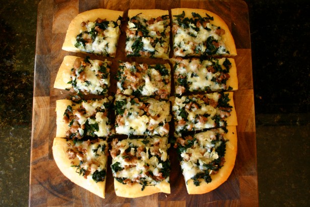 - Cook the dough in the oven with no toppings for 5 minutes. Don’t worry if air bubbles form–just deflate them before you put the toppings on. Pre-baking the dough will help prevent the cheese and toppings from getting overcooked. Remove dough from the oven and sprinkle on half of the cheese. Add the kale and sausage mixture. Add the rest of the cheese and top with the roasted onions. Brush a thin layer of olive oil on the crust. Return the pizza to the oven and cook for another 5-8 minutes until the crust is crispy and the cheese is just melted. Serve with a squeeze of fresh lemon on each slice.