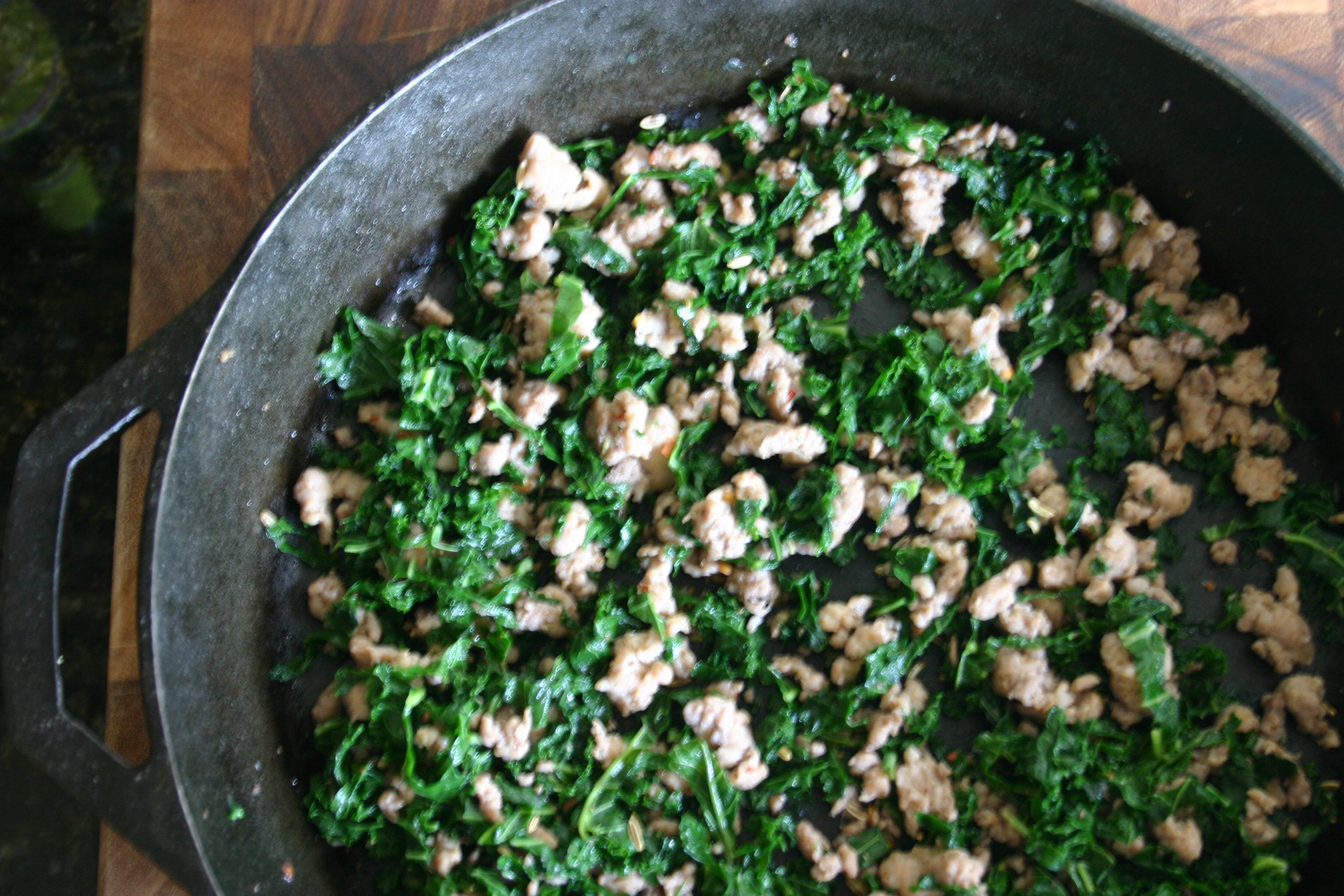 - Bring a heavy-bottomed pot or pan to medium heat on the stove top. Add sausage to pan and break it up into bite-sized pieces with a wooden spoon. Add celery seed and fennel seed and continue to brown the meat, stirring constantly until the sausage is almost fully cooked. There will likely be some bits of meat and stuff stuck to the bottom of the pan. If there is, add a tablespoon or so of red wine, stock, or water to help loosen up those delicious bits. Add the blanched kale to the sausage mixture and cook for 1 minute, stirring until incorporated. Add salt and pepper if needed.
